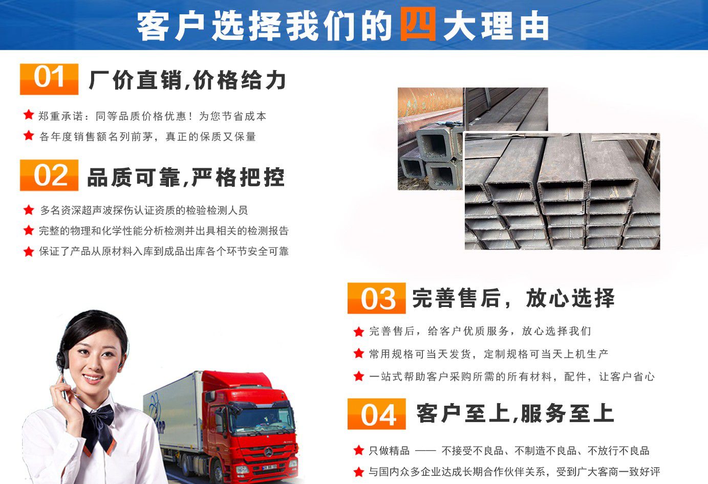 無錫盛灝特鋼有限公司長期銷售Q355B方矩管,鍍鋅方矩管,大口徑方矩管,厚壁方矩管,無縫方矩管等各種方管產品!產品廣泛應用于鋼結構建筑(鋼管混凝土、管樁、管桁架,橋梁、海上作業平臺、港口碼頭建設、電視通訊鐵塔、電力鐵塔等鋼結構管)。壓力管道(石油、天然氣、煤漿等輸送)、機械制輥等領域。  公司自創辦以來,一直堅持“誠信合作,共同發展”的經營理念?! ∫恢币詠砦覀儽局耙哉\相待,以信為本,互利互惠,共同發展”的長期方針,充分發揮現貨資源優勢為您提供“可靠的產品、過硬的質量、完善的服務”,歡迎廣大新老客戶前來洽談業務。  公司以“至誠至信,雙利雙贏”為根本宗旨,堅持科技興企的發展策略,恪守商規,創新進去,贏得聲譽,贏得了市場,得到了社會各階層的認可。公司以雄厚的實力、可靠的質量、儲存鋼管門類齊全、庫存量大之優勢,本著守法、守信、創新的理念,打造精品,發展鋼管多元化品種,滿足客戶各種需求,以低廉的價格、熱情的服務面向國內外客戶,歡迎鋼管界同仁加盟!我們為客戶提供周到的服務 !  公司為客戶提供以下服務  服務三保: 保證質量、保證時間、保證數量?! 》兆谥迹?雄厚的實力、優質的產品、低廉的價格、周到的服務?! ∨慵鏍I,一支起定。...